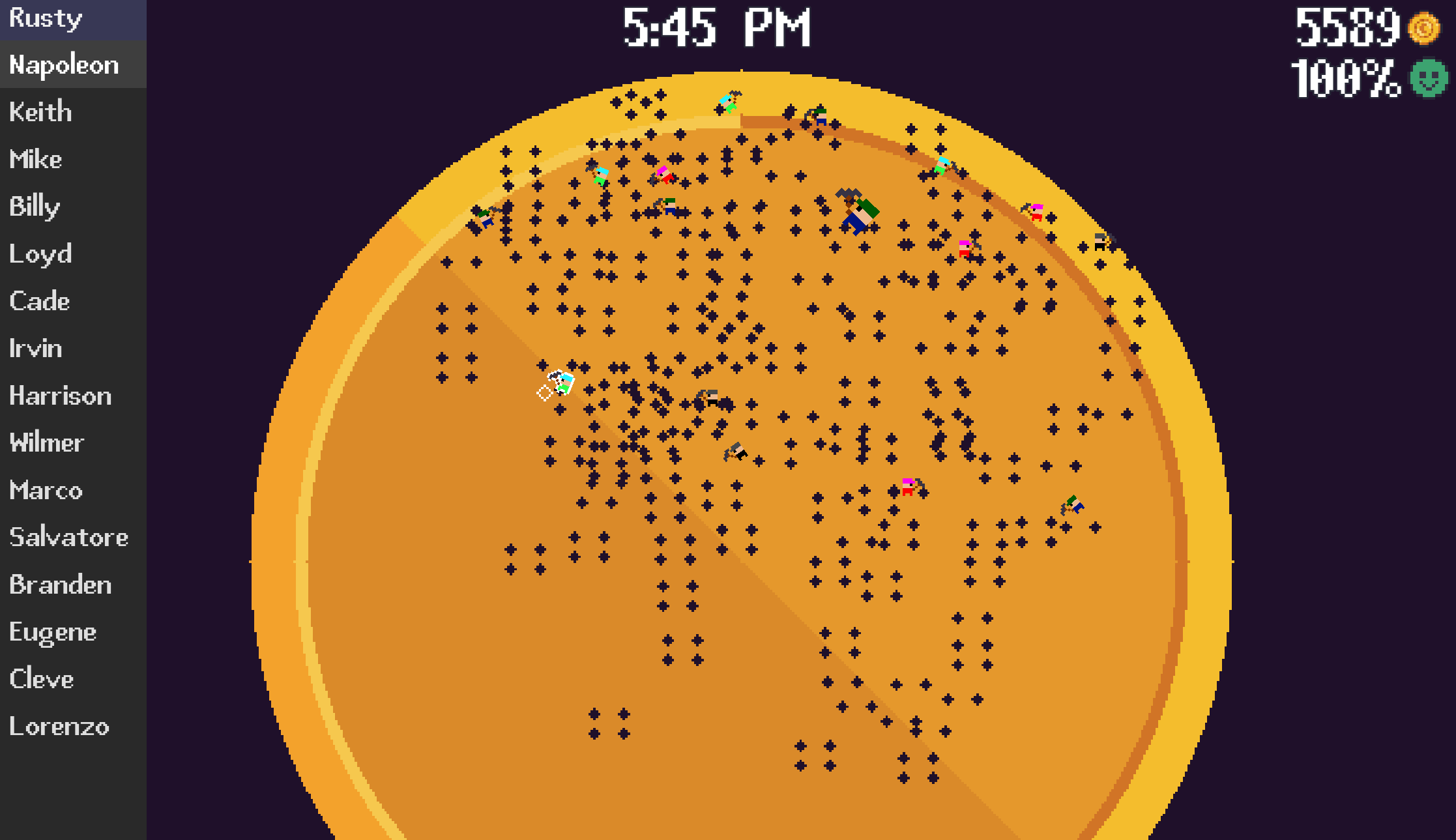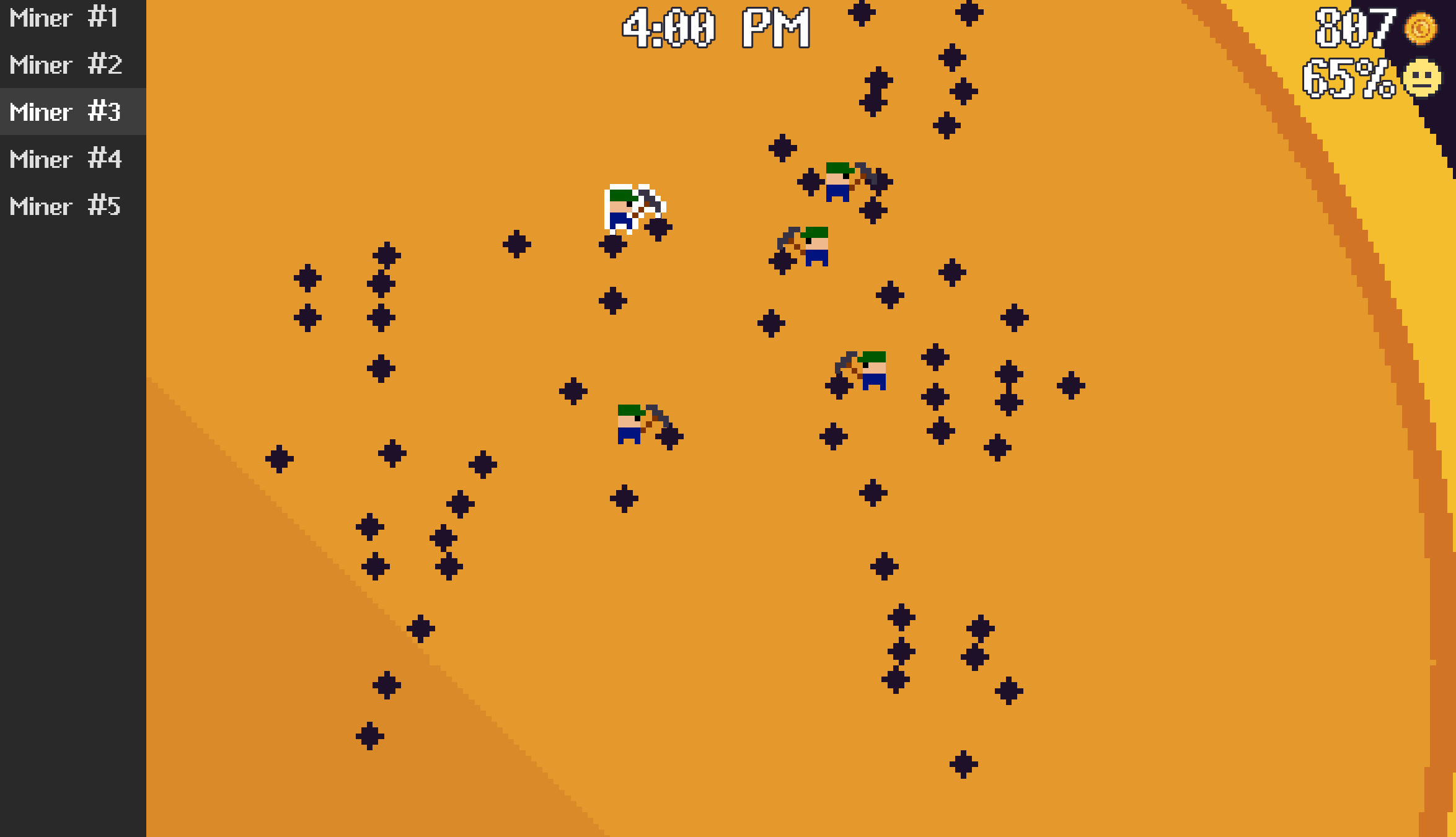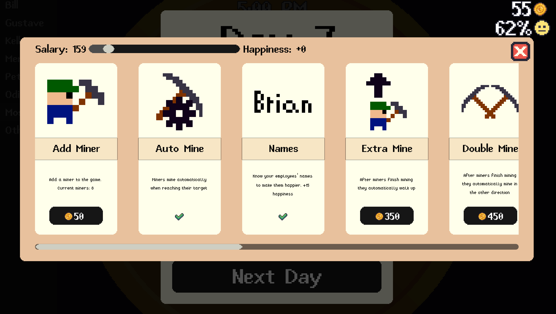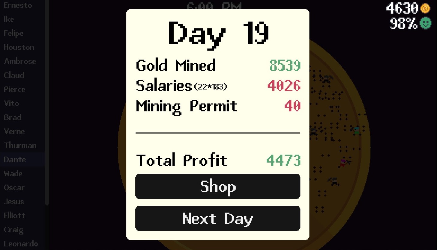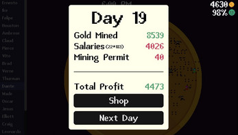 At the end of each day, you can visit the shop and buy upgrades that help you manage your mining team more efficiently, with less micro-managing.